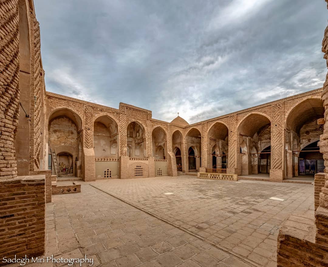 شکل کلی بنا شامل صحن یا حیاط در مرکز بوده و ستونها و رواقها در اطراف آن می باشد. از ویژگیهای مهم معماری مسجد می توان به ستونهای متنوع آن با اشکال مختلف استوانه، مربع، چند ضلعی و … یاد نمود که در سراسر مسجد قابل ملاحظه می باشد .